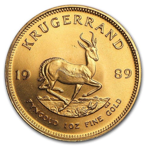 Sør-Afrikanske Krugerrand mynter er penger. Myntene er gyldig betalingsmiddel i Sør-Afrika, og godtas og veksles over hele verden.