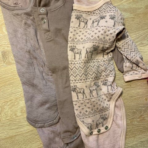 Selger en liten ullpakke i str 68( bodyen er str 62/68) Buksene er hele uten hull, men har noen små flekker/missfarginger(se bilder). Flekkene er ikke forsøkt fjernet, så mulig de går vekk i vask. Kan også forekomme nupper. Bodyen er uten hull og flekker. Merker er fix, name it, reflex og cubus.