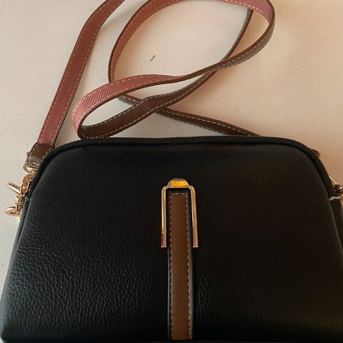 Vesken har et mønster i hvit og svart farge, med sort håndtak og detaljer. Den har en åpen topp med et romslig hovedrom og et innerrom med glidelås for oppbevaring av mindre gjenstander.