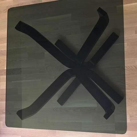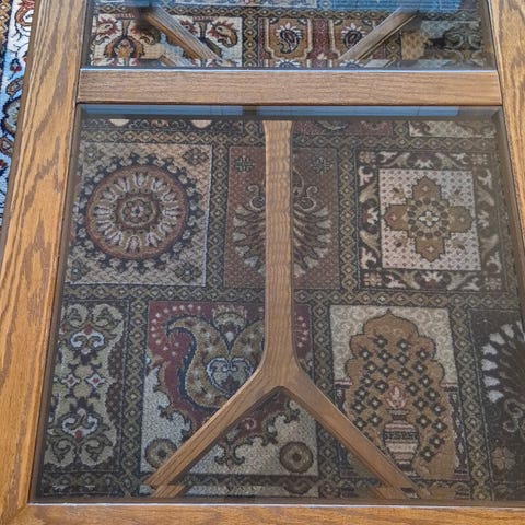 Bord i eik med glassplate på toppen og flettet underlag. Bordet har en sekskantet form og ben med dreide detaljer, som nytt. Selges kr 1500.