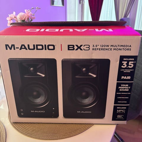Helt nye M-Audio BX3 høytalere, 3.5" 120W. Så si ubrukte kun åpnet for å på den og teste 1 gang. Passer perfekt til å produsere musikk, livestream, pidcast eller generelt for å høre på musikk. De ble kjøpt i forbindelse med musikk produksjon men ble aldri brukt, så derfor selges de.