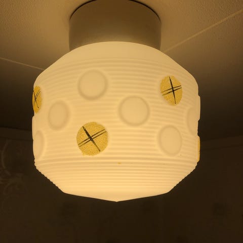 Selve takoppheng er i plastikk, da originalt glassoppheng var i dårlig stand og dermed skiftet ut