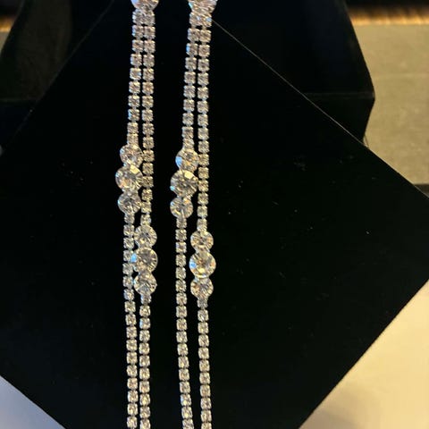 Ørepynt med glitrende anheng. Gullfarget eller sølvfarget, det er to ulike. Ikke brukt. Prisen er for ett par. Kan sendes for 31 kroner som brev, eller for 73 kroner med sporingsnummer, du velger. kan hentes. Vipps.