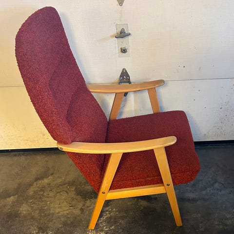 Selger en flott vintage lenestol. Noe normale bruksmerker/slitasje på treverket med tiden, men stolen er ellers i god stand og veldig komfortabel.