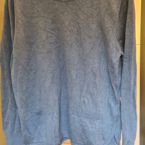 Kjøpte den med tanke på at den skulle være oversize, men har aldri brukt den. 3/4 ermer, fine detaljer, fin fasong. Str lappe er klippet bort.