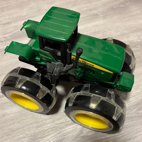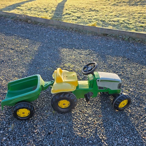 John Deere barne traktor med tilhenger i fargene grønn og gul. Traktoren er designet for barn og har et ratt for styring. Tilhengeren kan kobles til traktoren for lek og transport av små gjenstander.
