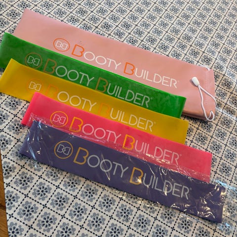 Booty Builder treningsstrikk med en bredde på 2,5 cm. Strikken er rosa og kommer med en oppbevaringspose i samme farge. Egnet for styrketrening og motstandsøvelser.