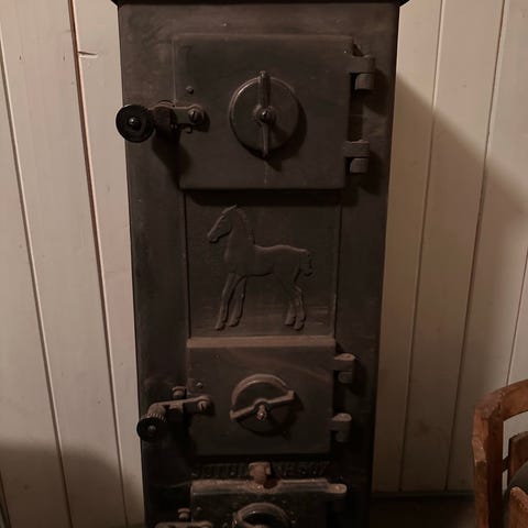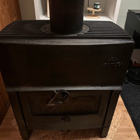 Vedovn i støpejern med lukket dør og håndtak i metall. Fargen er mørk grå. Egnet for oppvarming av rom.