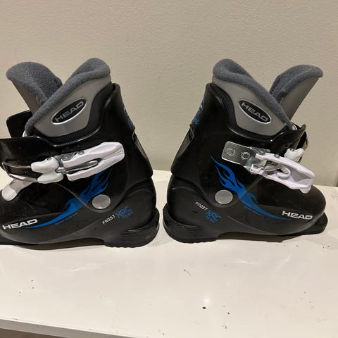 Rossignol Power slalåmstøvler i størrelse 205 mm, tilsvarer cirka str 32 i vanlig sko. Støvlene er hvite og utformet for barn. De har flere spenner for justering og støtte. Mykt for inni.