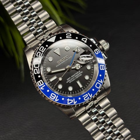 Selger en elegant og stilig modifisert Seiko GMT MOD bygget med kvalitetsdeler og et øye for detaljer. Perfekt både til hverdagsbruk og som en statement-klokke til finere anledninger.