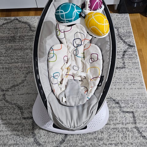4moms vugge med elektrisk bevegelse, grått stofftrekk og innebygd kontrollpanel. Produktet er beregnet for barn og har justerbare funksjoner for komfort og beroligelse.