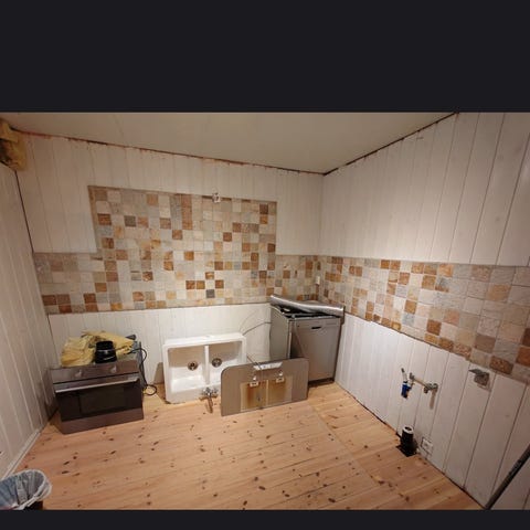 Kjøkkeninnredning gis bort. Inkluderer to vasker, to blandebatterier (Oras), oppvaskmaskin, komfyr og vifte. Kjøkkenet har jeg malt hvitt, var opprinnelig blått.