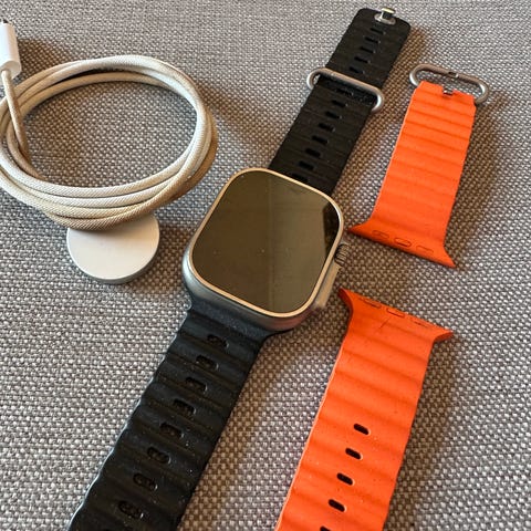 Selger en meget pent brukt Apple Watch Series 7 i den største størrelsen (45mm). Dette er Cellular + GPS-modellen, som betyr at du kan ringe, sende meldinger og strømme musikk rett fra håndleddet uten å ha med telefonen på tur.