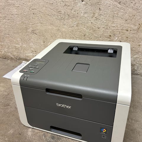 Brother HL-4570CDW fargeskriver med trådløs tilkobling. Skriveren har et kontrollpanel med skjerm og knapper for enkel betjening. Egnet for utskrift av fargedokumenter i kontormiljø.