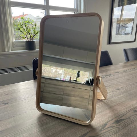 Du bestemmer selv stilen på speilet ved å sette på eller ta bort dekorasjonen på toppen. Du kan legge småting som smykker eller sminke på det lille brettet under speilet.