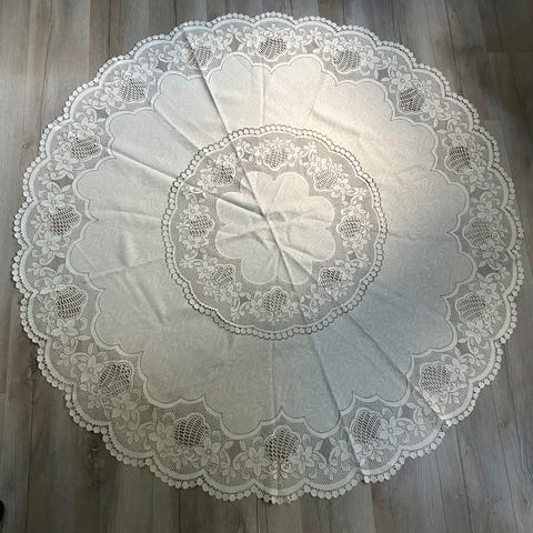 4 dekorative duker i ulike størrelser og farger. Diameter på dukene er fra 140-155cm. Alle dukene er ubetydelig brukt, uten flekker. Selges samlet for 600kr