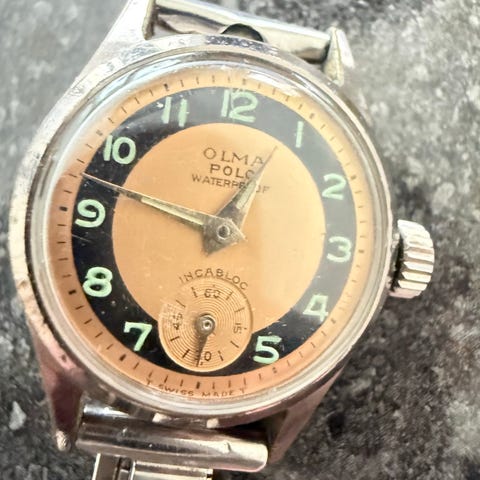 Sportsur med skru-inn-krone, men kan ikke garantere noen form for vanntetthet på vintage ur som ikke er trykktestet.