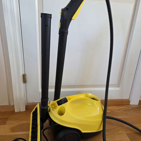 Damp steamer/ dampvasker med tilbehør. Produktet er hvitt og har en kompakt design med kontrollknapper og trykkmåler. Egnet for rengjøring av ulike overflater ved bruk av damp. Kjøpt ny rett før jul brukt kun 1 gang, men kjøpte feil type.
