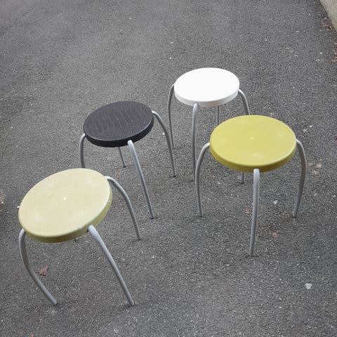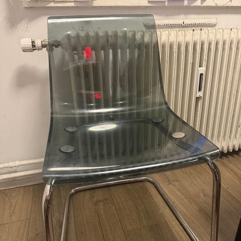 Krakk med rund oransje sitteflate og fire buede metallben. Passer til bruk som ekstra sitteplass eller ved arbeidsbord.
