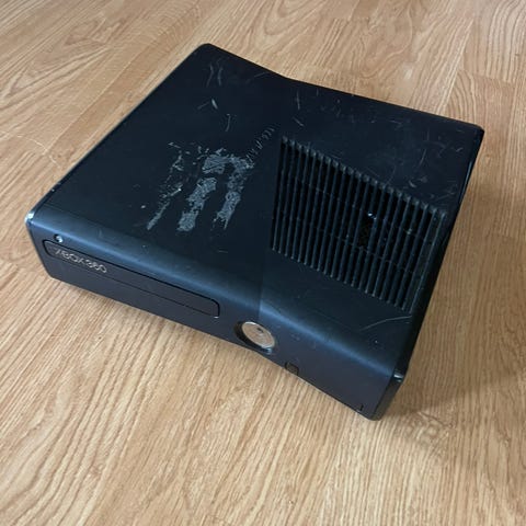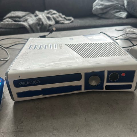 Microsoft Xbox 360 spillkonsoll i hvit farge. En konsoll for videospill med tilkoblingsporter for HDMI og nettverk. Passer til bruk med Xbox 360-spill og tilbehør.