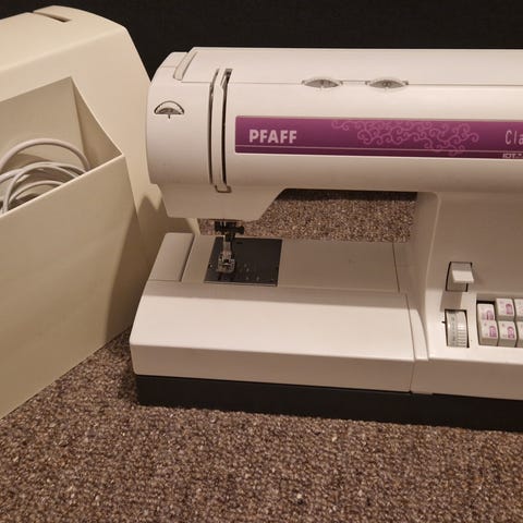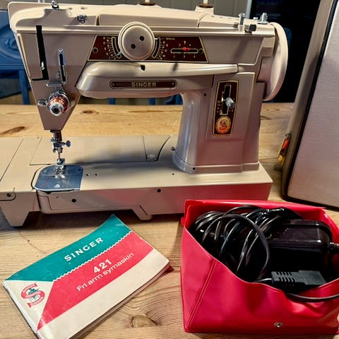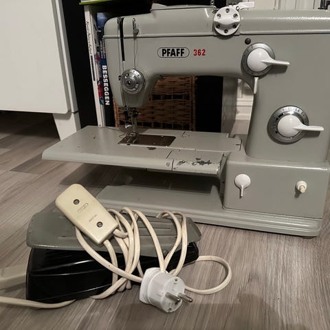 Symaskinen er i bra stand, renset og smurt.