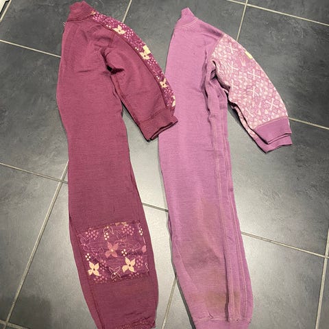 To heldresser i ull (ullfrotté) selges rimelig. Mye bruk igjen. Begge dressene har en del nupper. Den røde dressen har også en svak flekk på ene foten. Ellers ingen anmerkninger. Mye bruk igjen.