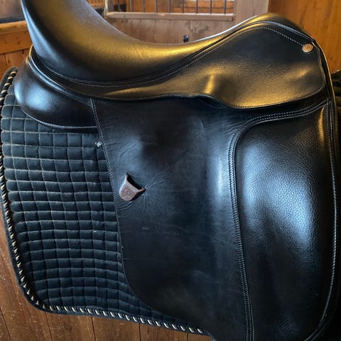 Amerigo dressursal i svart lær. Kalveskinn i sete og kneputer.