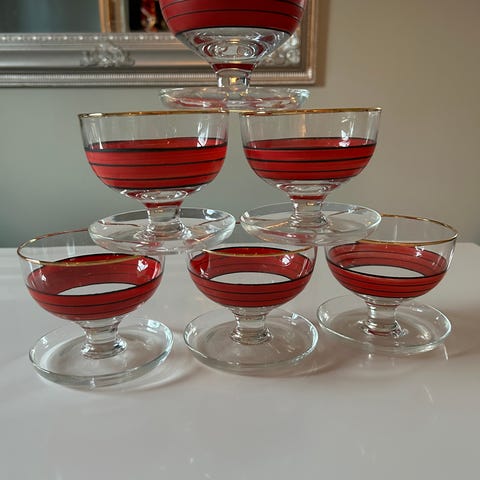 Selger fem vakre dessertskåler med blomsterdekorasjoner fra Randsfjordglass og en dessertbolle.