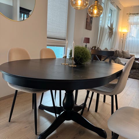 Det følger med to stk ileggsplater som har praktisk oppbevaring under bordet. Enkelt å justere på etter behov. Plass til ca 12 personer med begge platene i.