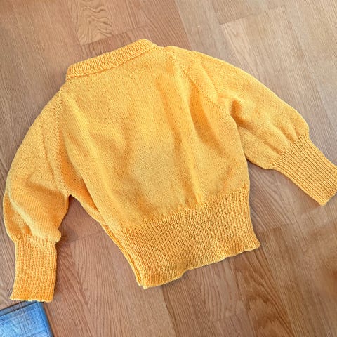 Genser med søte detaljer i ermene og knyttesnoter. Strikket i tynn alpakkaull fra Sandnes garn. Aldri brukt.