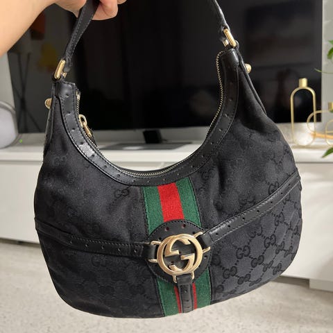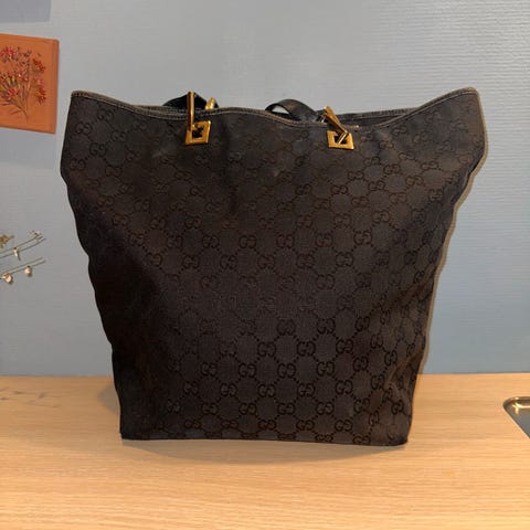 Gucci stoff dameveske i svart farge. Vesken har justerbar skulderrem og metallbeslag. Materialet er stoff med detaljer i skinn. Kjøpt på Collectors cage. Følger med ektehetsbevis