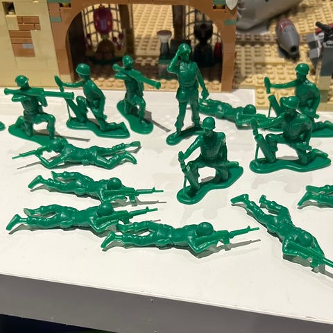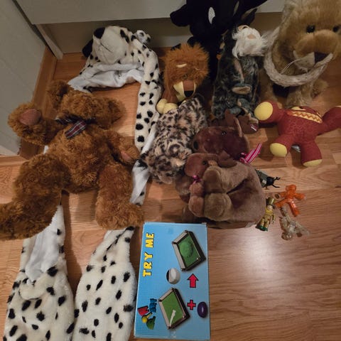 Selger en stor kasse med blandede leker. Inneholder blant annet: