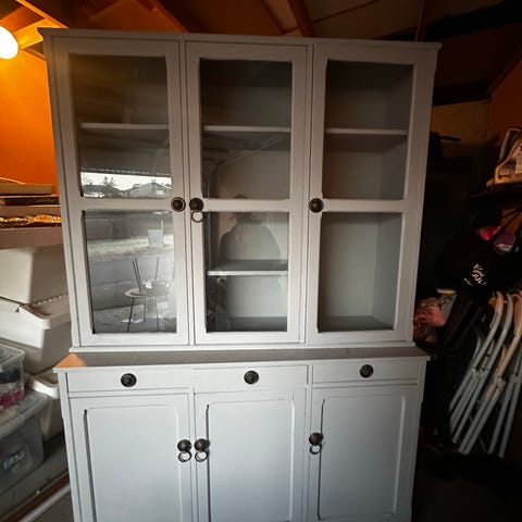 Skjenk, vitrineskap og 9stk.spisestuestoler selges samlet. Dette er av hvitmalt tremateriale. Målene står oppført ved bildene.