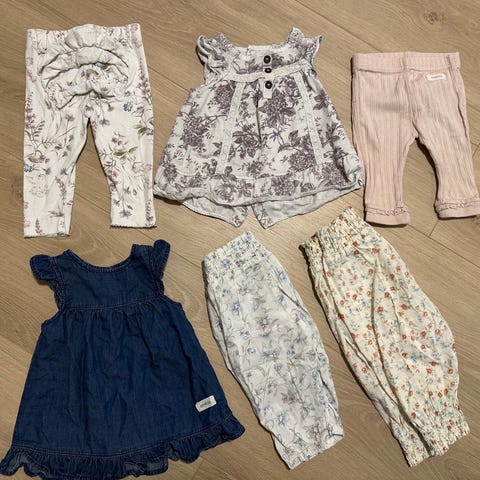 Newbie barneklær for jente i størrelse 68 med flerfarget design. Inneholder ulike plagg i forskjellige farger og mønstre, egnet for små barn.