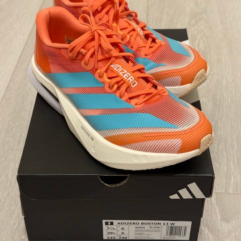 Veldig pent brukte Adizero Boston løpesko. Kjøpt høsten 2025 og brukt 6 ganger på mølleøkter, aldri ute. Passet ikke optimalt til min fot.