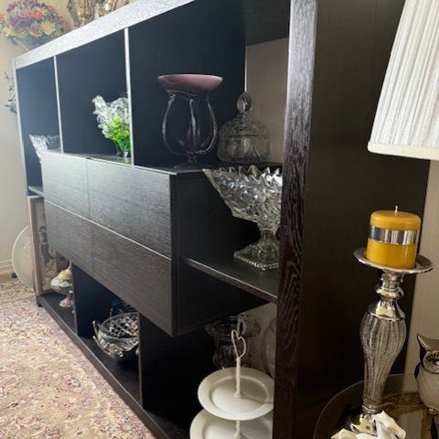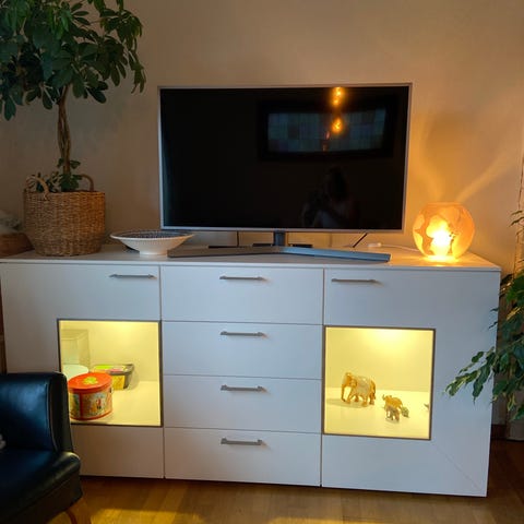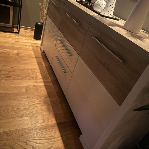 Skjenk i høyglans hvit selges rimlig pågrunn av kosmetisk skade på venstre dør.