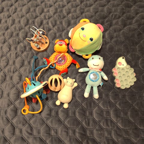 L41. Pakke: Fine treleker i naturfarget. Vognremse med marihøner. Tretønne og bite leker. Lekepakke (C) 175kr