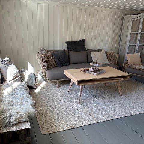 Selges dessverre da finstua vår flyttes til et mindre rom og teppet blir for stort.