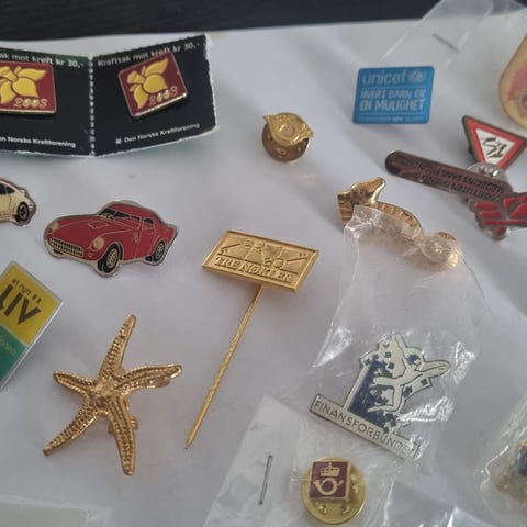 Pins- samling fra håndball-VM for damer i 1993, 79 pins. Pris for samlingen på pinsguiden.no er 3000 kr.