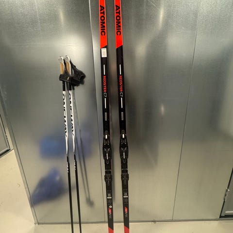 Atomic Redster X7 langrennsski med lengde 148 cm. Skiene har bindinger montert og er egnet for klassisk langrenn.