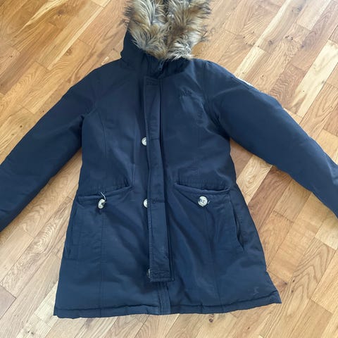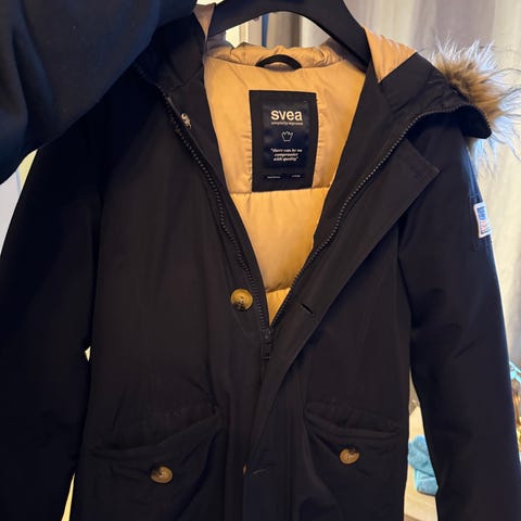 Svea miss smith yttertøy i dun, størrelse M for dame. Jakken er mørke grå og har hette med pelskant. Materialet er dun, som gir isolasjon og varme deili og varm vinterjakke som går ned over rumpa.