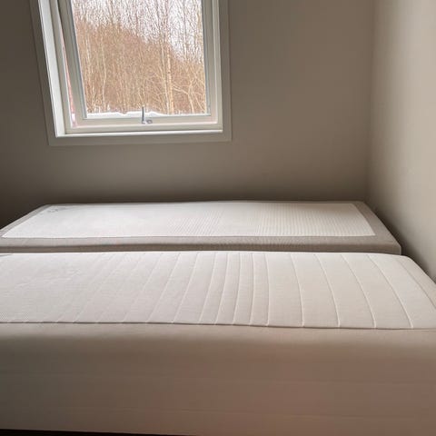 Gir bort to senger gratis! IKEA sengestamme laget av tre og stoff. Sengestammen har et enkelt og funksjonelt design med trelameller for støtte. Stoffet er mørkegrått. Passer til en enkeltseng. Lamellene trenger reparasjon. Kan hentes!