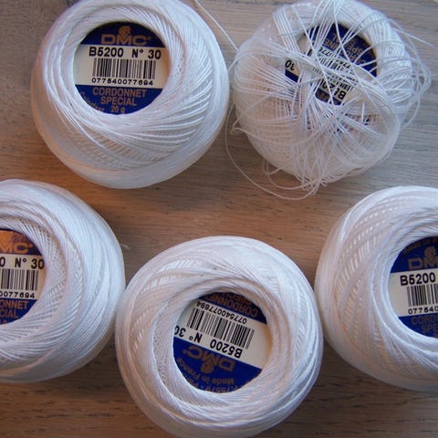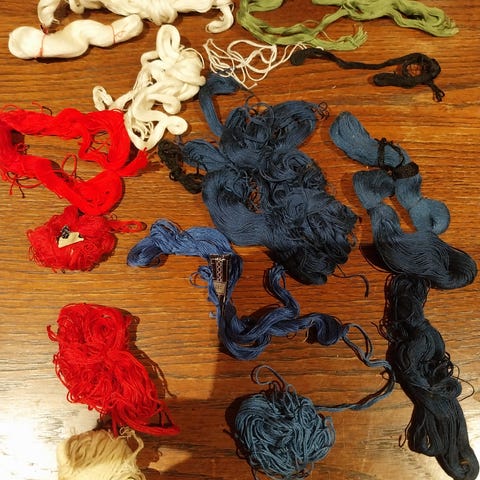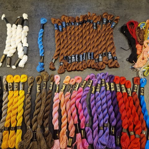 Driver du med geriljabrodering eller annen brodering der det ikke er så nøye med nummer på fargene. Her er det mye brodergarn. Mange farger. Noen remser med stoff kan følge med. Selges høystbydende over kr 400.