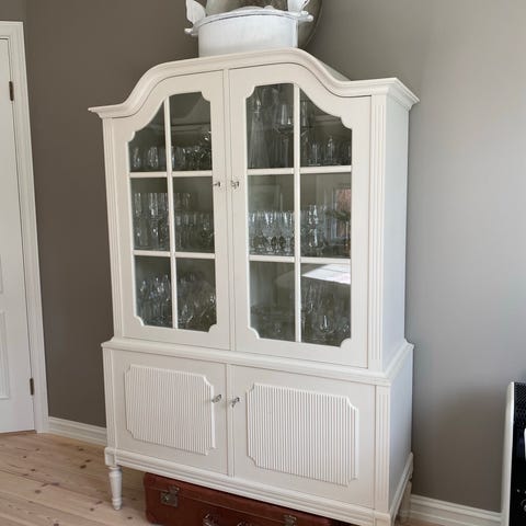 Antikk hvitt vitrineskap laget i tre med glassdører. Svensk møbel, ukjent produsent. Skuffer og dører med messinghåndtak og nøkkellås. Pent holdt, men noen små bruksmerker her og der som forventet. Over og underhel henger sammen. Ca mål, 2m høyde, bredde 1.3m, dybde 42cm. Må hentes i Trondheim