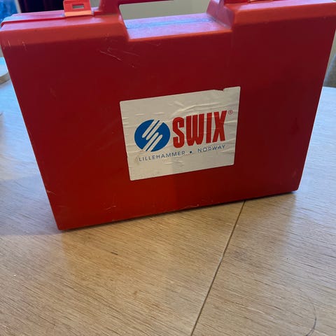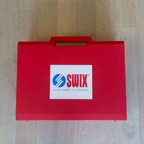 Swix smørekoffert med ulike smøremidler, voks, og tilbehør for skismøring. Inkluderer flere typer smørevoks, rensemidler, børster og instruksjonshefte. Leveres i en rød plastkoffert for organisert oppbevaring.