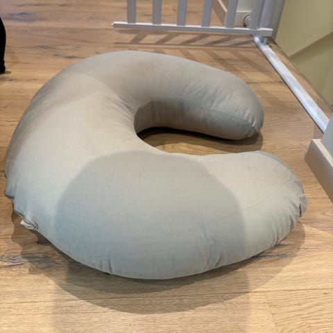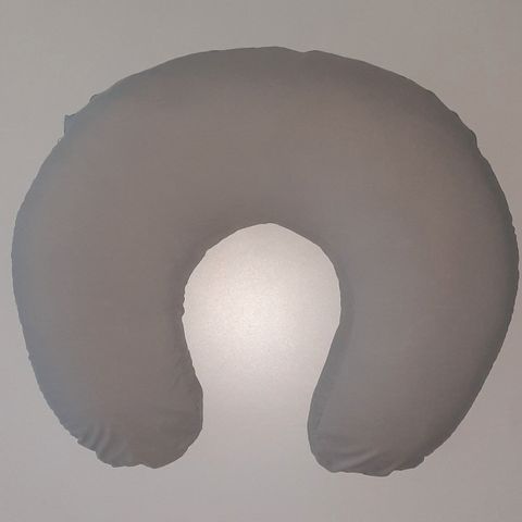 Grå ammepute i stoffmateriale. Trekk kan kjøpes på IKEA. Beskyttelsestrekket bør vaskes. Passer til bruk under amming for støtte og komfort.