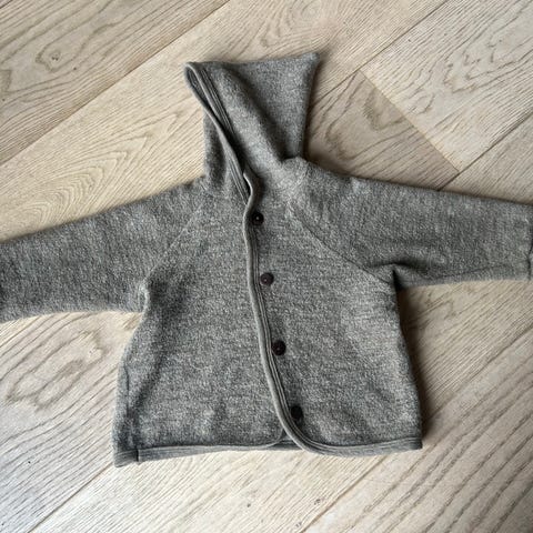 Nøstebarn størrelse 80 (det står str 92, men jeg synes den ser mindre ut) laget av merinoull i grå farge. Passer for både gutter og jenter (unisex). Plagget er laget av naturlig materiale som gir god varme og komfort.