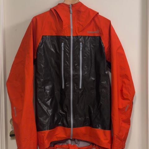 Norrøna jakke i størrelse L, farge svart, laget av Gore-Tex materiale. Jakken er designet for utendørs bruk og har hette og flere glidelåslommer.