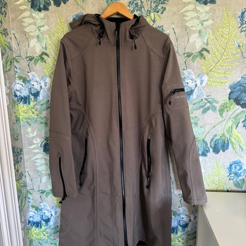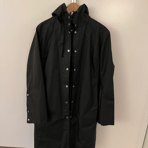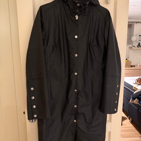 Ilse Jacobsen Regnffakk med sydvest i beige farge. Størrelse S, laget av polyester. Det har falt av en knapp ellers ingen skader. (Se bilde)