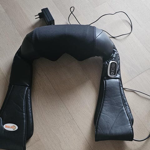 Elektrisk nakkemassasjeapparat i grå og hvit farge med flere massasjeputer for effektiv muskelavslapning. Utstyrt med ladekontakt for enkel lading. Designet for bruk på nakkeområdet.